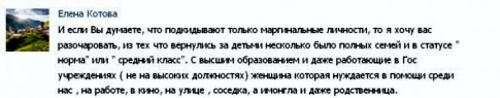 «Но на самом деле мы сейчас говорим не о маргиналах, пьяницах и бомжах – это совсем другая история. Такие люди обычно как раз оставляют детей, потому что они для них часто являются средством заработка. Мы говорим о нормальных женщинах, попавших в тяжёлые жизненные обстоятельства, понимающих, что не готовы прокормить ребёнка. Часто у таких матерей уже есть дети, и они боятся, что появление нового малыша загонит их в такую нищету, что служба опеки заберёт всех».