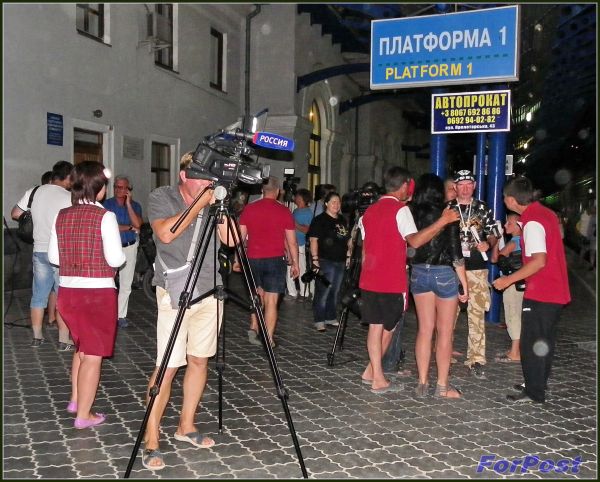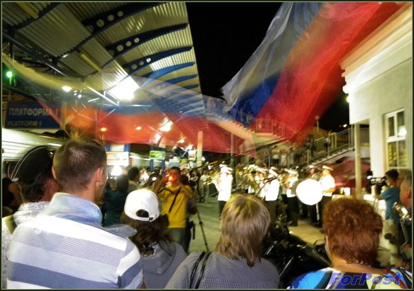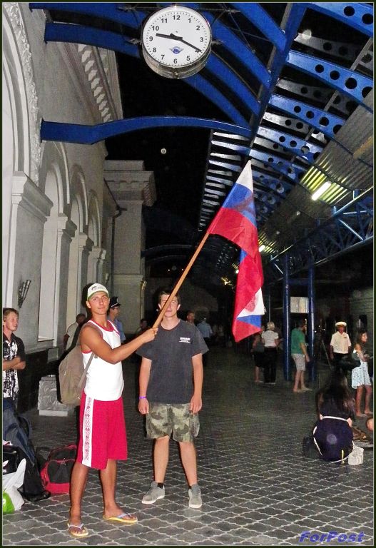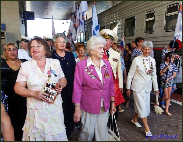 На перроне нас уже ждали: высокий подиум обтянут тканью цветов гвардейской ленты, кругом представители СМИ. Надев парадные костюмы, делегаты с флагами и плакатами вышли из вагонов. Главы организаций поднялись на трибуну. Торжественные речи принимающей и прибывшей сторон