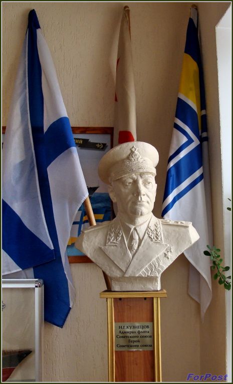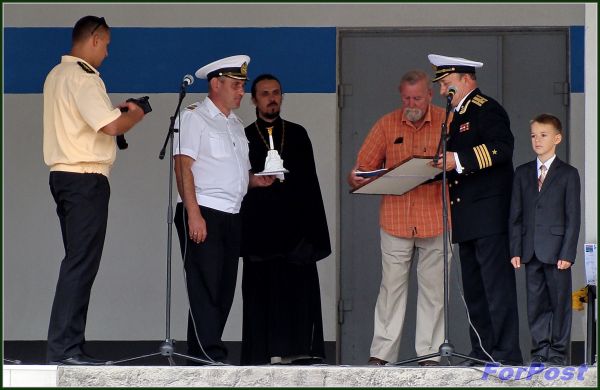 - От имени командующего ЧФ, всех воинов-черноморцев поздравляю вас с началом нового учебного года! Вы вступаете в него в год 230-летия Черноморского флота и этого славного героического города, созданного флотом. Я хочу отметить, что флот немало сделал для создания этой Флотилии. Каждый моряк должен быть образованным, грамотным, смелым, мужественным, горячо и беззаветно любящим свою Родину, быть преданным морю, как Николай Герасимович Кузнецов, чьё, имя носит Флотилия. Когда его, проведшего флот через горнило Великой Отечественной войны, в 1951 году отстранили от командования флотом, он сказал: "Меня отстранили от управления флотом, но никто не сможет меня отстранить от помощи флоту". Вручаю командованию Флотилии книгу о нём.