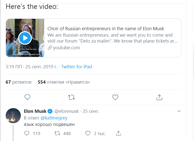 «Язык хорошо подвешен», — написал Илон в ответ на сообщение Екатерины Павлюченко, которая обратила внимание в своем твиттере на билборд и шуточную песню Only Elon in Our Hearts, записанную на манер композиции «Крылатые качели» из фильма «Приключения Электроника».