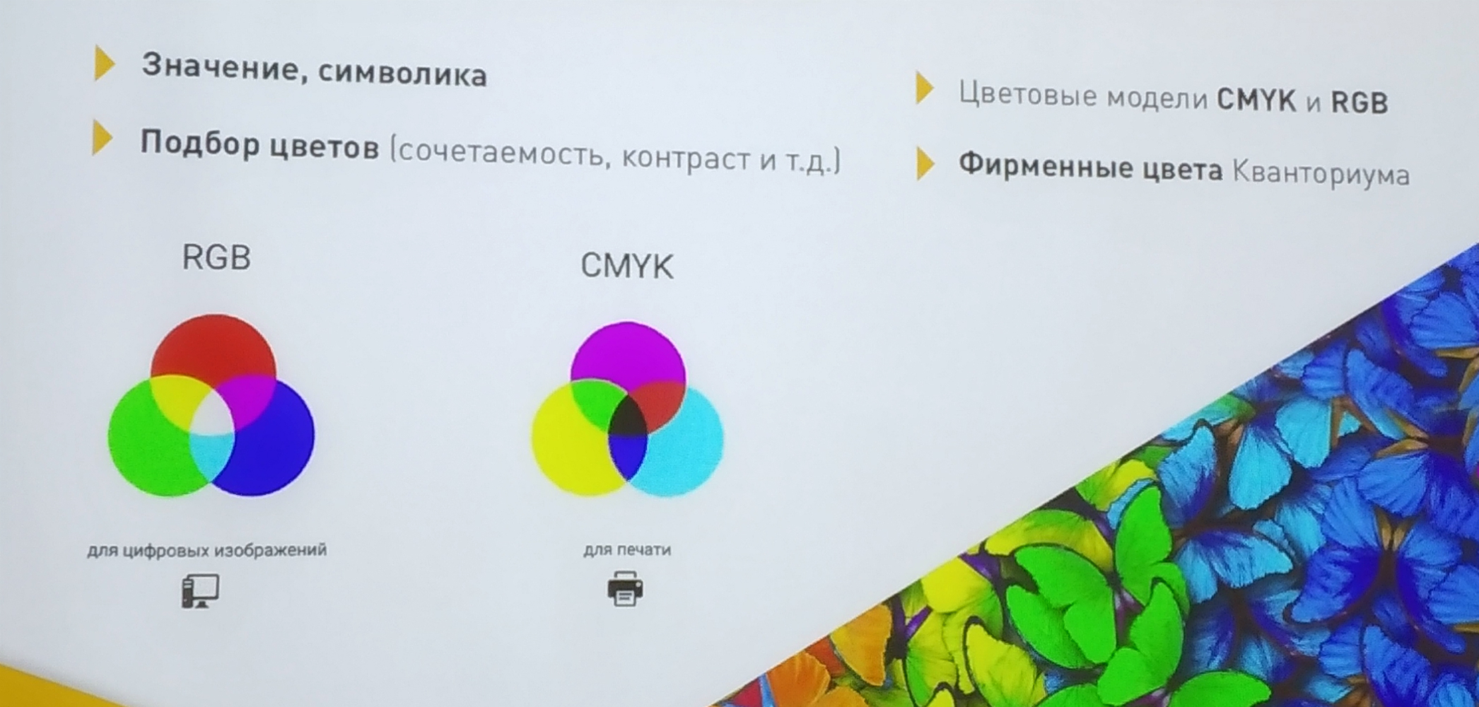 «Планируя композицию, необходимо учитывать восприятие человеком информации. Мы считываем информацию слева направо, затем сверху вниз. Важно также помнить, что сначала взгляд задерживается на объектах большого размера. Таким образом, крупный текст или картинка в верхнем левом углу люди заметят раньше другой информации. Не должно быть много мелких деталей, а тонкие линии хорошо смотрятся на контрастном фоне. Это нужно учитывать при создании макета», – рассказала кванторианцам Наталья Семенова.