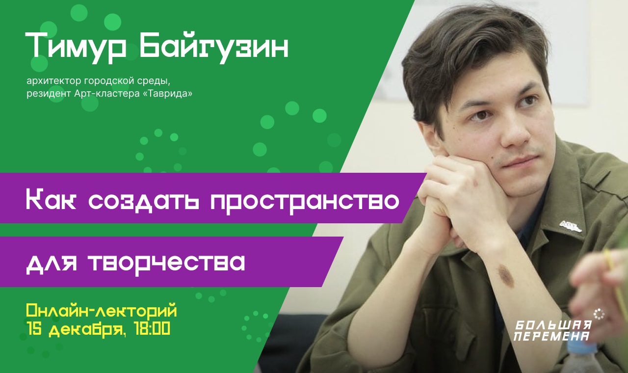 15 декабря архитектор городской среды, резидент арт-кластера «Таврида» Тимур Байгузин расскажет участникам конкурса о том, как создать креативное пространство.