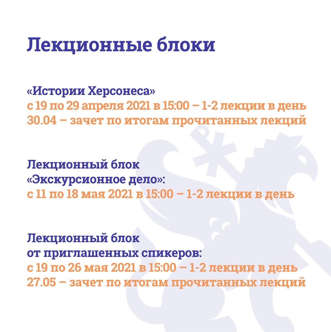 Обучение стартует 19 апреля и будет содержать в себе лекционные блоки «Экскурсионное дело» и «История Херсонеса». После обучения добровольцы сдадут зачёт по итогам пройденных материалов. Участники программы получат сертификаты, которые не только станут хорошим дополнением к портфолио, но и дадут им возможность дальнейшего трудоустройства в музее-заповеднике «Херсонес Таврический». Лучшие слушатели смогут в течение июня проводить по несколько экскурсий в день.