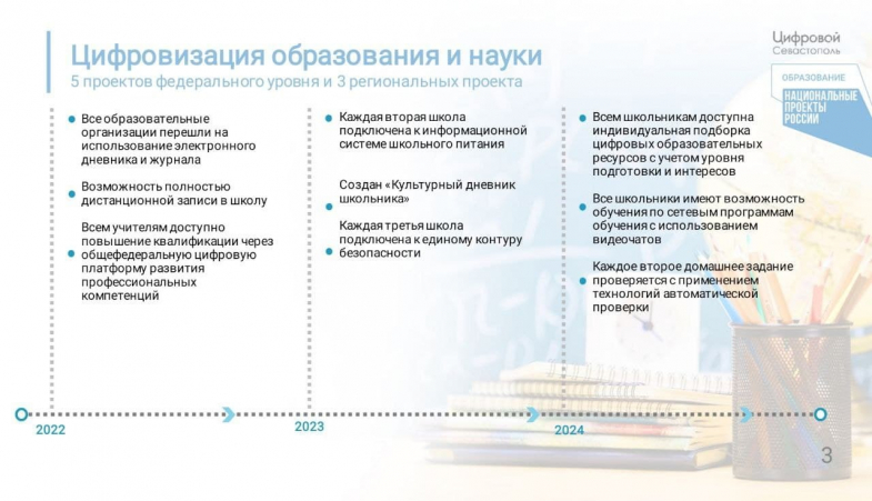 К цифровой образовательной системе подключены уже более 60 учебных заведения Севастополя, которые охватывают около 53 тысяч школьников, более 3,5 тысяч учителей и почти 30 тысяч родителей. Уже сейчас родители могут получить доступ к информации об оценках, назначенным домашним заданиям, расписанию ребёнка и другим возможностям.
