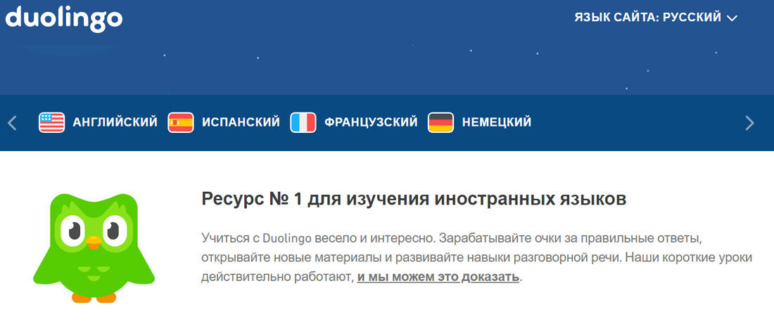 В особом представлении вряд ли нуждается. И всё же ни одна подобная компиляция не может обойтись без этого сайта. Он позволяет в лёгкой и интересной форме выучить язык с нуля (особенно если уделять этому достаточно времени). Выполняя задания вроде «переведи предложение» или «составь перевод из предложенных слов», вы будете продвигаться по дереву прогресса, улучшая свой уровень и получая доступ к более сложным тестам. А если вы пропустите день обучения, об этом напомнит харизматичная зелёная сова.