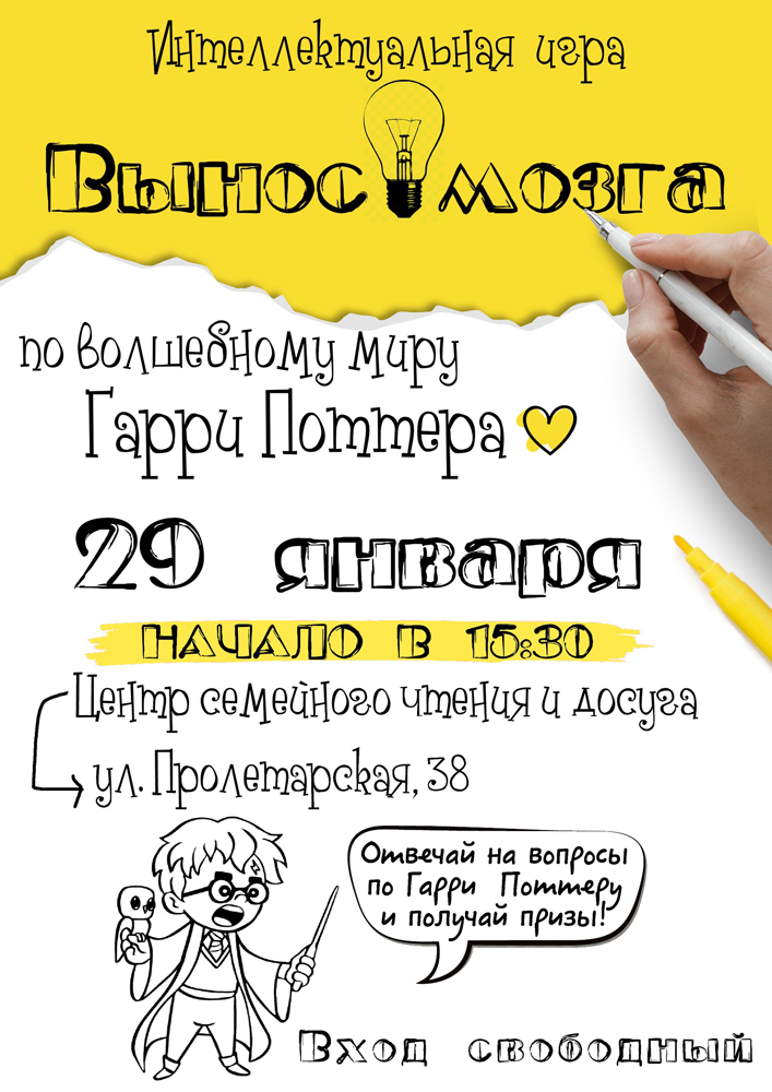 Представьте ситуацию, когда в школе или вузе вам задают вопрос по литературе, истории, алгебре, а вы не знаете ответа. «Эх, если бы вопрос был по Гарри Поттеру, стал бы круглым отличником», — подумали бы вы. Почему бы и нет? Фан-клуб «Фаны.Здесь» приглашает принять участие поттероманов всех возрастов в командной интеллектуальной игре «Вынос мозга» по волшебному миру Гарри Поттера.