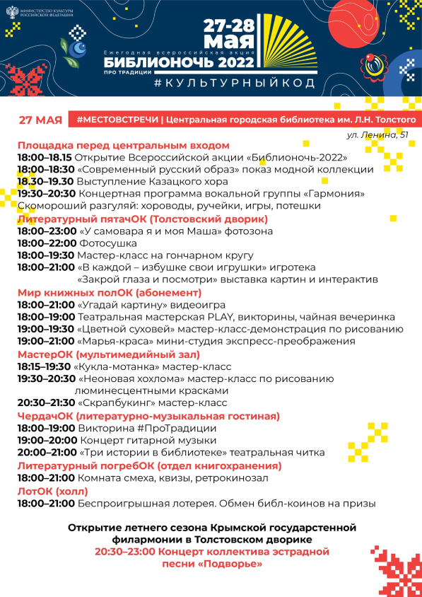 В этом году Библионочь проходит под девизом «Про традиции». Вас ждёт интерактивное прикосновение к истории, искусству, традициям и ремёслам. Приходите в библиотеку вашего района и погружайтесь в мир героев народных сказок, знакомьтесь с промыслами, участвуйте в мастер-классах, квизах, викторинах и конкурсах, посещайте музыкальные концерты и театральные постановки.