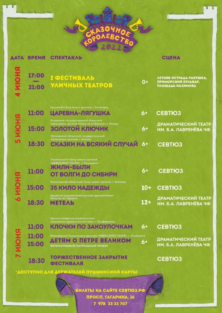 С 1 по 7 июня в Севастополе пройдёт VI Всероссийский фестиваль театрального искусства для детей «Сказочное королевство». Помимо спектаклей, школьников ждёт образовательная программа от жюри и экспертов проекта — тренинг на игровое самочувствие, занятие по театротерапии и многое другое.