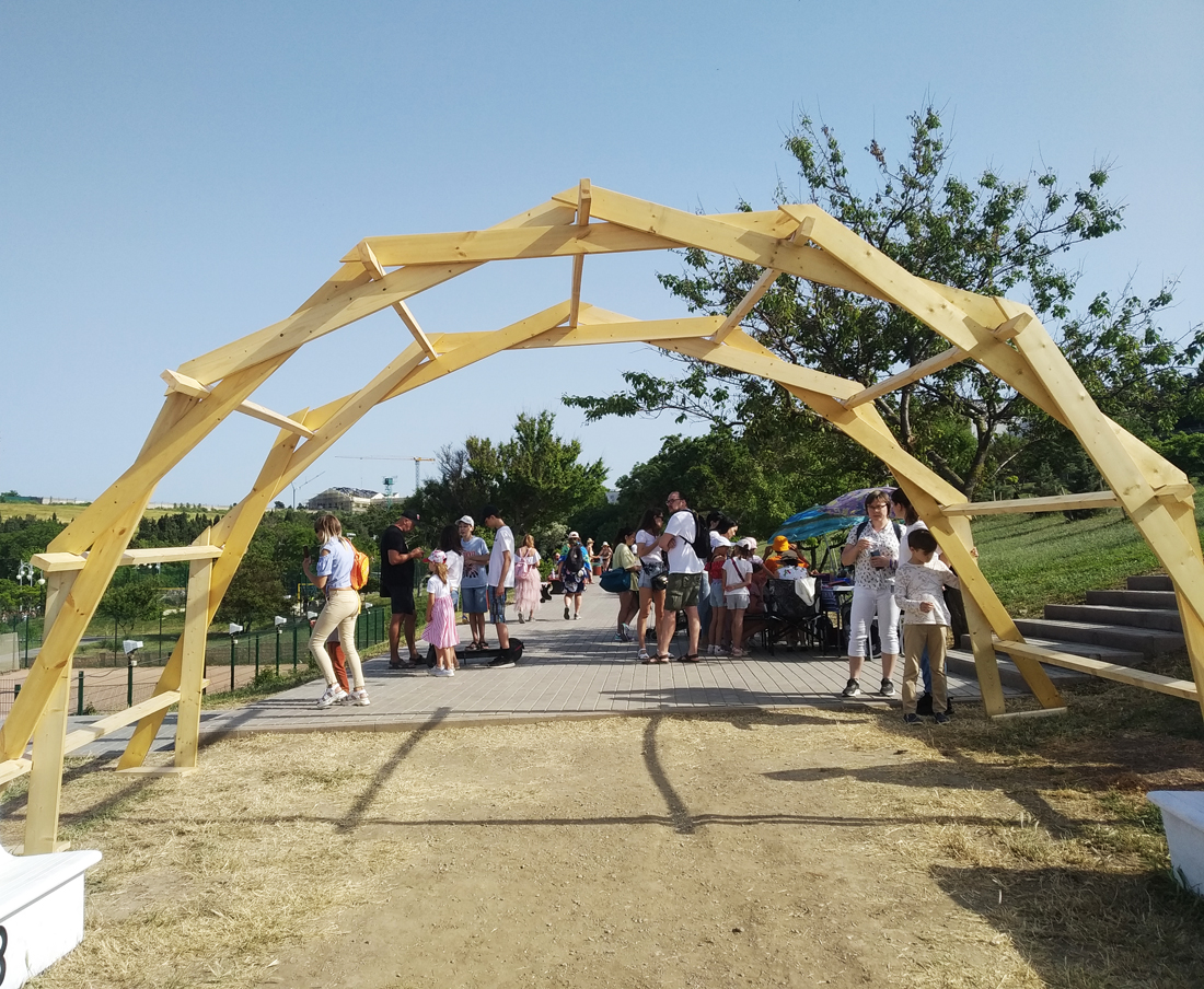В парке имени Ахматовой участники «Маршрута Вдохновения» вместе с гостями фестиваля возвели 8-ми метровый мост Леонардо да Винчи. Справиться с задачей удалось всего за 10-15 минут – самоопирающаяся конструкция понятна и проста в сборке.