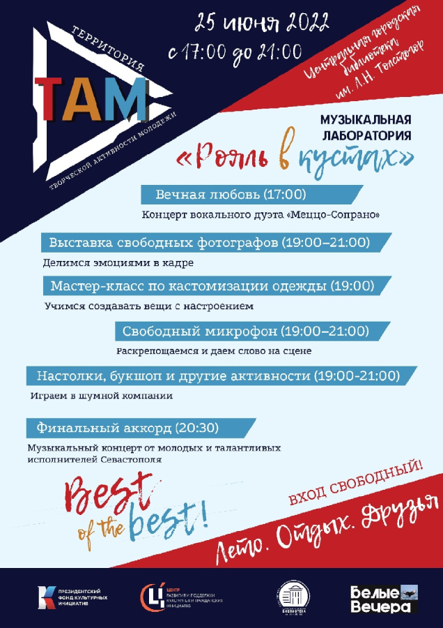 Ещё раз в этом убедиться вы сможете на музыкальной лаборатории «Рояль в кустах» проекта «Территория ТАМ». Главный партнёр и организатор молодёжной программы — Белый вечер | Севастополь.