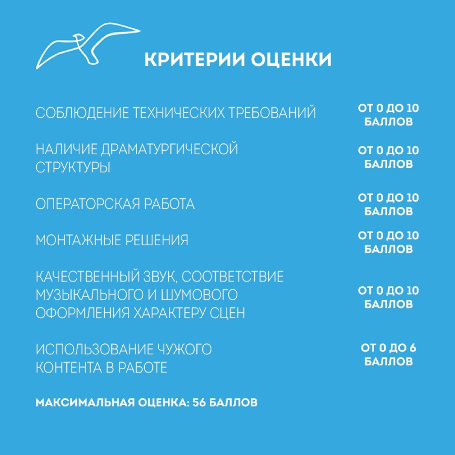 Следите, чтобы не было брака по звуку и заваленного горизонта. Видео будет оцениваться не только со сценарной позиции, но и с технической.