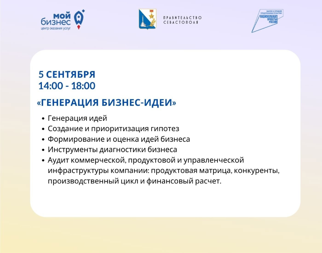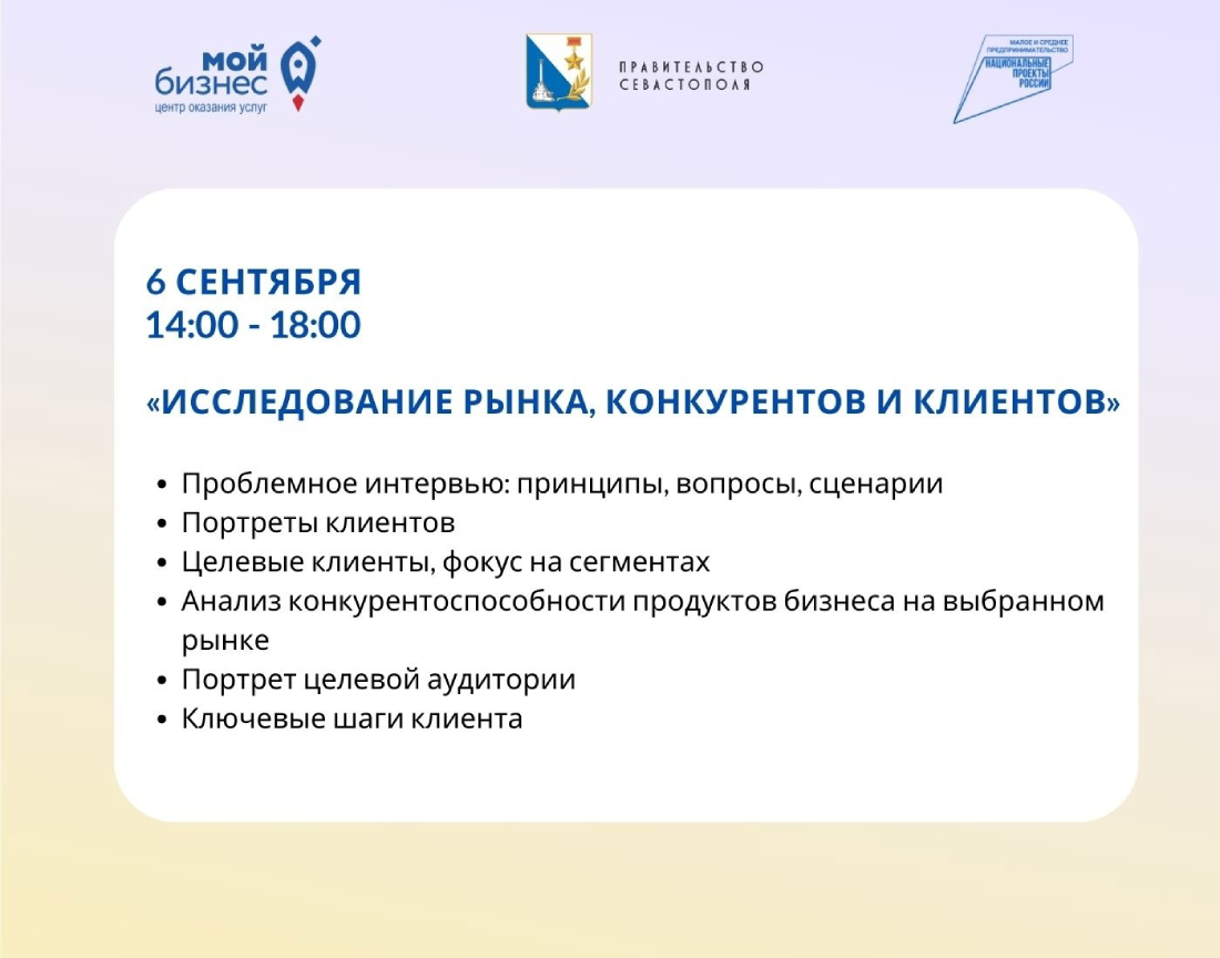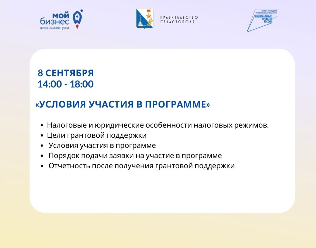 Напомним, поддержка реализуется в рамках национального проекта «Малое и среднее предпринимательство и поддержка индивидуальной предпринимательской инициативы». С подробной информацией по условиям конкурса можно ознакомиться здесь. Кроме того, вы можете получить консультацию в департаменте экономического развития Севастополя (8692) 54-18-44 или в Центре «Мой Бизнес» по адресу: просп. Октябрьской Революции, 42-Б, корпус 6, телефон для справок:+7 869 222-92-92.