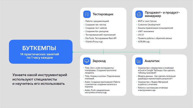 — серии практических занятий (буткемпы) по 5 направлениям: зерокодинг, ручное тестирование, аналитика, управление проектами и управление продуктами. Каждый буткемп включает 14 занятий длительностью 1 час. Если захотите, вы можете пройти буткемпы по всем направлениям.