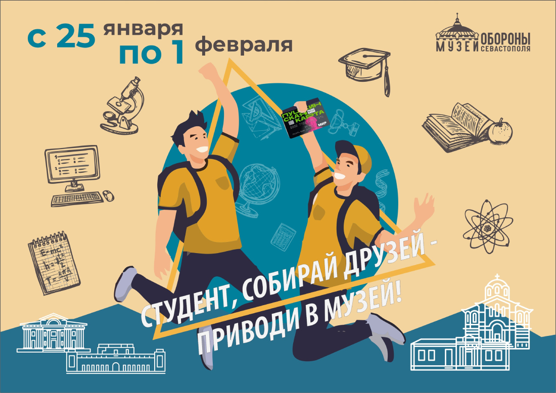 Ко Дню студента Музей обороны Севастополя запускает акцию «Студент, собирай друзей – приводи в музей!». С 25 января по 1 февраля учащиеся вузов, приобретая билет на любую экскурсию музея-заповедника по Пушкинской карте, получат второй билет в подарок.