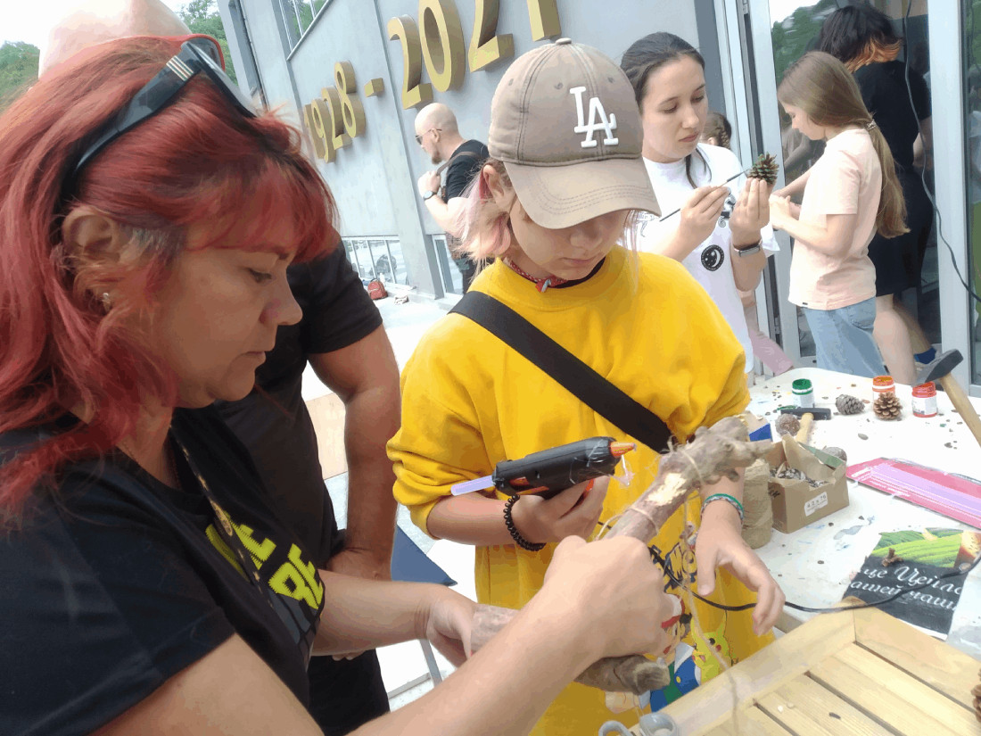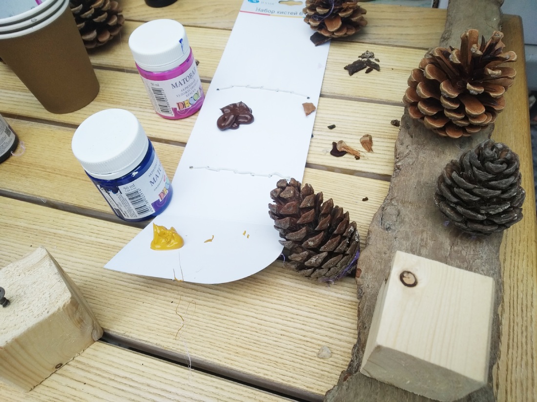 Несмотря на то, что мастер-класс был ориентирован на школьников от 12 лет, занятие не могли обойти стороной самые маленькие участники фестиваля. Они учились приклеивать гальку, делать из стеклянной гальки окна, а из шишек — черепицу для дома. Приклеивать к дереву домики, вкручивать саморезы помогали родители. Таким образом, у многих получился семейный тандем.
