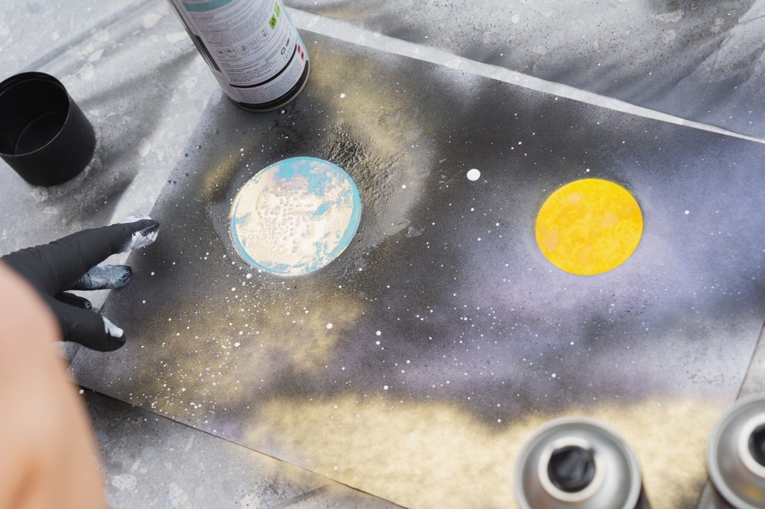 Рисование баллончиками с краской — это не только граффити, рисование на вертикальных поверхностях. Необычную технику под названием «spray paint» можно использовать для рисунков на картоне, плотной бумаге или даже дереве. На мастер-класс фестиваля была выбрана беспроигрышная для этого направления тематика рисунка – космос.
