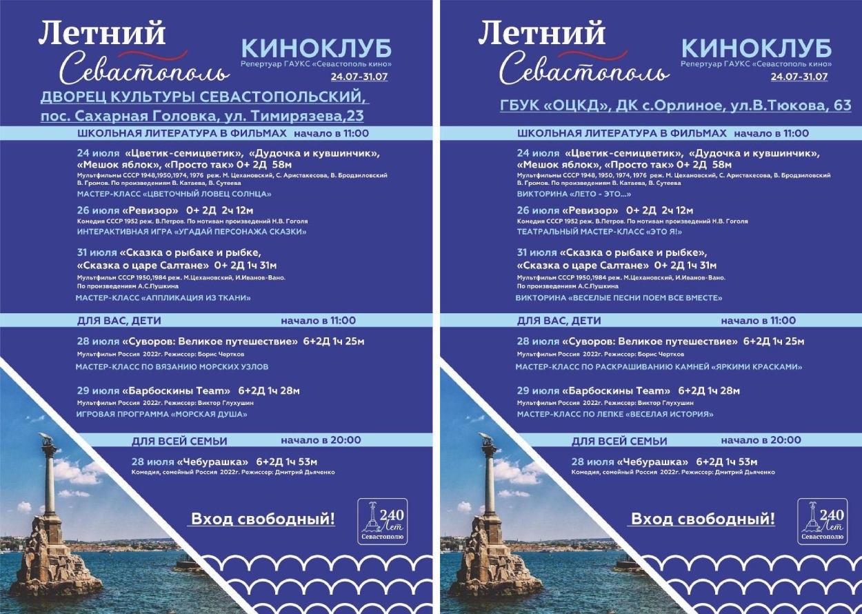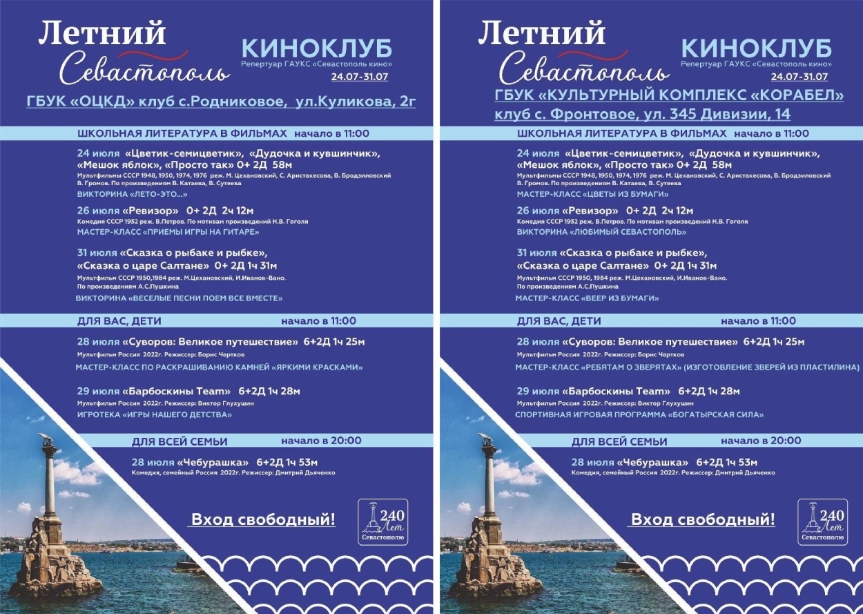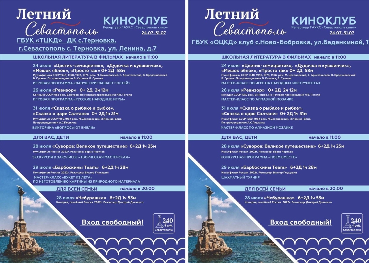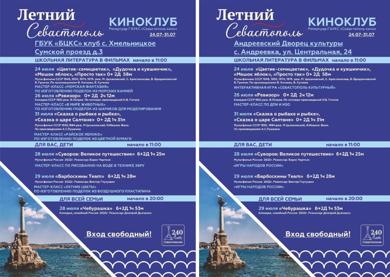 Впервые в рамках творческого проекта «Летний Севастополь» в сельских Домах культуры и клубах стартует показ кинокартин. Помимо тематических кинопоказов для детей и взрослых запланированы мастер-классы, викторины, интерактивные игры. Школьники смогут научиться рисовать на воде, вязать морские узлы, освоить азы игры на музыкальных инструментах, создать картины из природных материалов и многое другое.