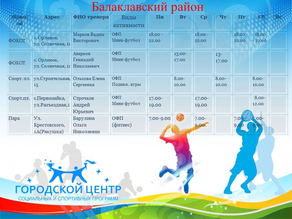 Меньше занятий будет и в Нахимовском районе. Не будут работать инструкторы: Дмитрий Мудрый (ОФП, мини-футбол, стритбол) и Максим Егоров (ОФП, волейбол, пионербол, подвижные игры).
