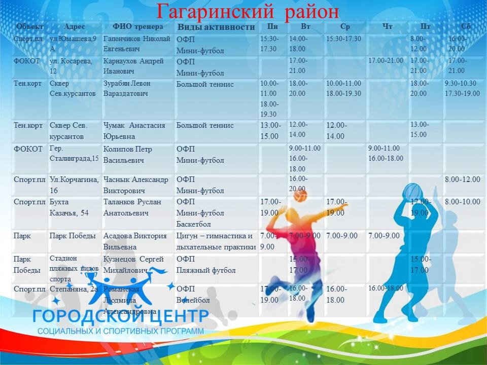 Зато в Гагаринском районе увеличится количество тренировок. Занятия с Пётром Колиповым (ОФП и мини-футбол) теперь проходят по адресу: Героев Сталинграда, 15.