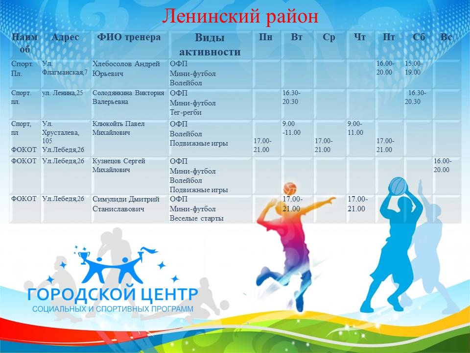 В Ленинском районе отменены занятия с Владимиром Гореловым. Его направления: ОФП, баскетбол, подвижные игры. Кроме того, тренировки с Сергеем Кузнецовым проходят только по воскресеньям с 16-00 до 20-00.