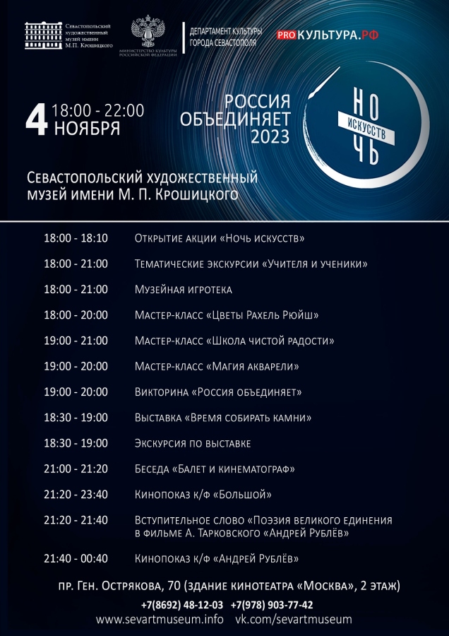 4 ноября во всех российских регионах пройдёт традиционная ежегодная акция «Ночь искусств». В этом году её мероприятия приурочены ко Дню народного единства и пройдут под девизом «Россия объединяет». Музеи и театры, выставочные залы, библиотеки и культурные клубы проведут тематические мероприятия в офлайн- и онлайн-формате. О мероприятиях в Севастополе — в нашем материале.