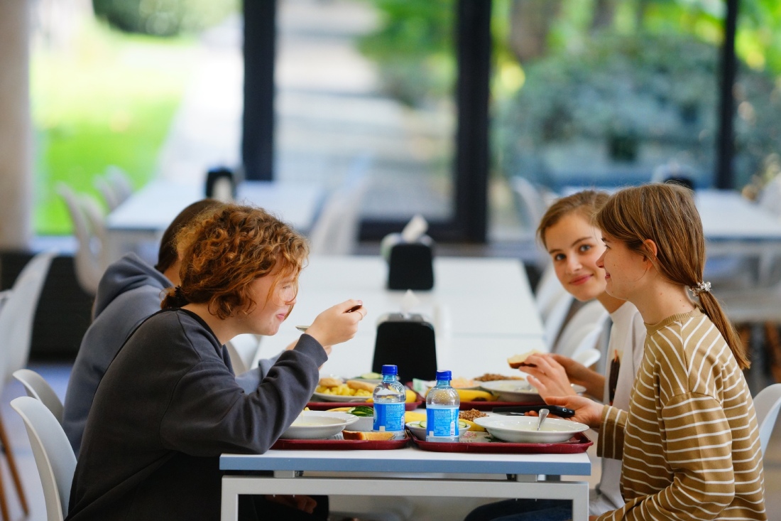 Днём и вечером предлагается ассортимент закусок и блюд из рыбы, птицы, мяса, печени, гарниры. Каждый ребёнок может выбрать одно из двух блюд: закуску, мясное блюдо и гарнир по желанию. Школьникам также предлагают блюда из творога и овощей, фрукты по сезону, холодные и горячие напитки.