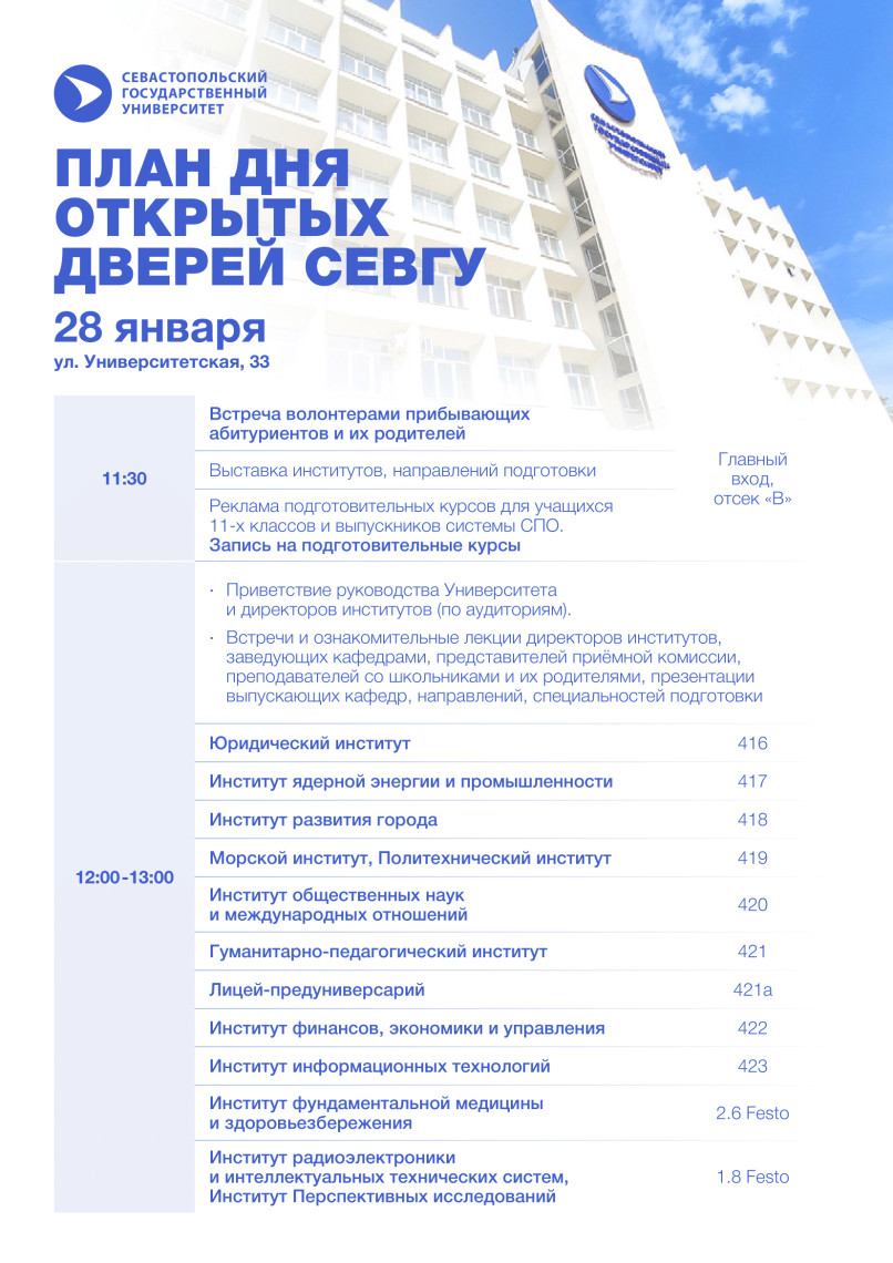 28 января в Севастопольском госуниверситете пройдёт очередной День открытых дверей. Абитуриенты и родители узнают, как подготовиться к поступлению и получить дополнительные баллы к ЕГЭ, получат информацию о подготовительных курсах для учащихся 11-х классов и выпускников системы СПО. Гости смогут принять участие в мастер-классах и экскурсиях и оценить условия обучения в университете и его инфраструктуру.