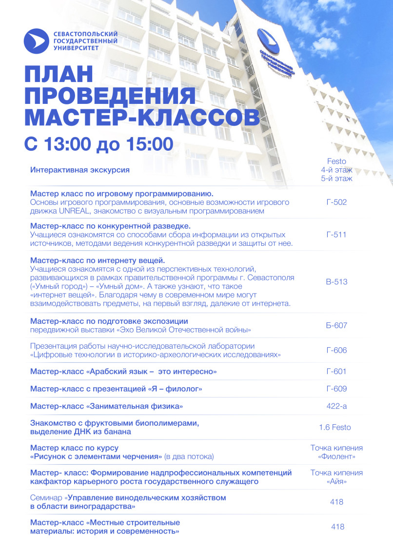 Гостей ждут мастер-классы по филологии и занимательной физике, рисунку с элементами черчения, формированию компетенций, необходимых для карьерного роста госслужащих, современным строительным материалам, виноградарству и виноделию.