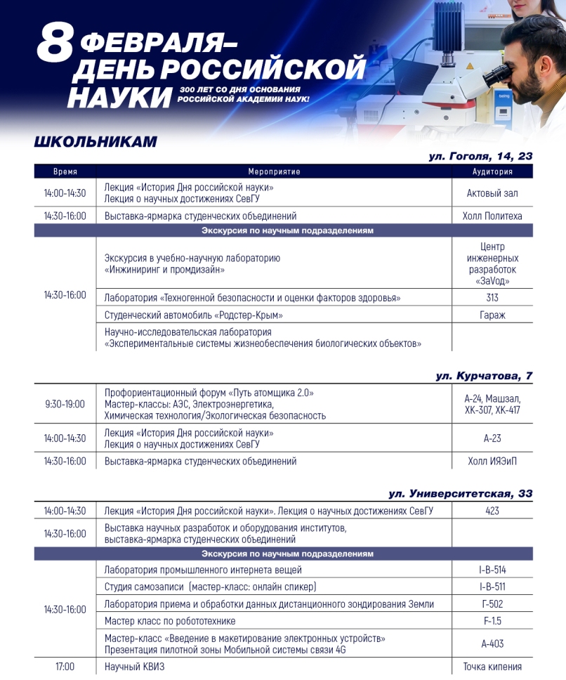 8 февраля отмечается День российской науки. В этом году праздник приурочен к 300-летию со дня основания российской Академии наук. Школьники, студенты и все желающие смогут посетить лекции, мастер-классы и экскурсии на четырех площадках СевГУ: в главном конкурсе на Университетской, в Голландии (ул. Курчатова, 7), в корпусе на ул. Гоголя, 14 и на Корнилова, 1.