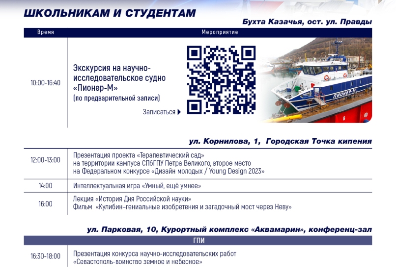 Для школьников и студентов пройдёт экскурсия на научно-исследовательское судно «Пионер-М» (по предварительной записи). В курортном комплексе «Аквамарин» будет презентация конкурса научно-исследовательских работ «Севастополь-воинство земное и небесное».