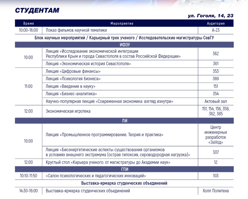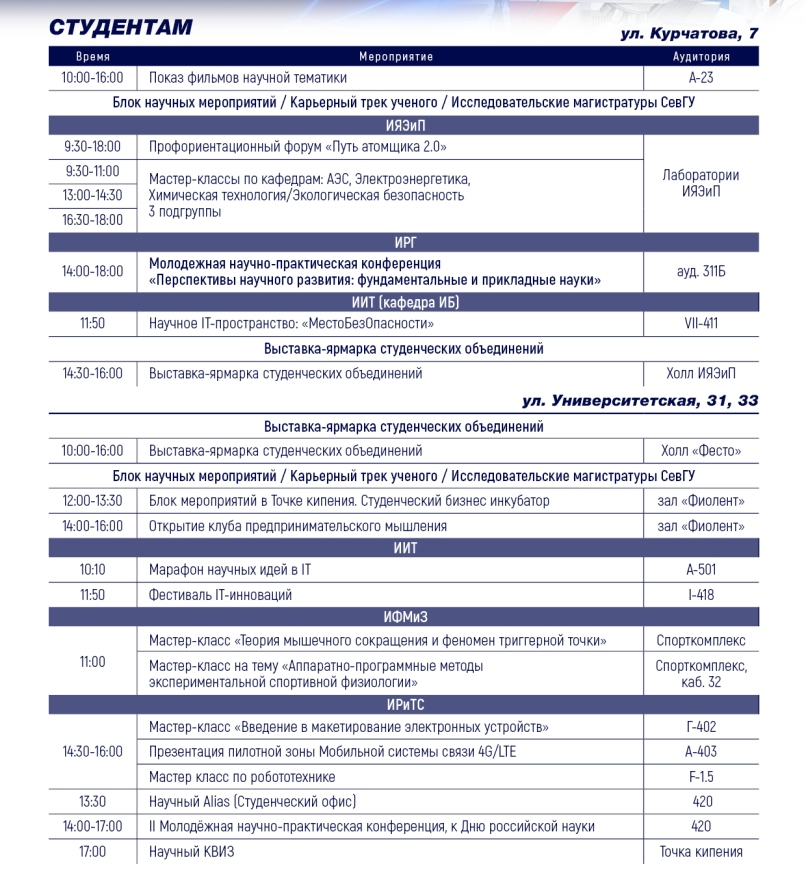 Для студентов запланирован профориентационный форум «Путь атомщика 2.0» и выставка-ярмарка студенческих объединений. Откроет свои двери клуб предпринимательского мышления. Участникам праздника также предложат пройти научный квиз. Институты представят научные разработки и оборудование на выставке научных достижений.