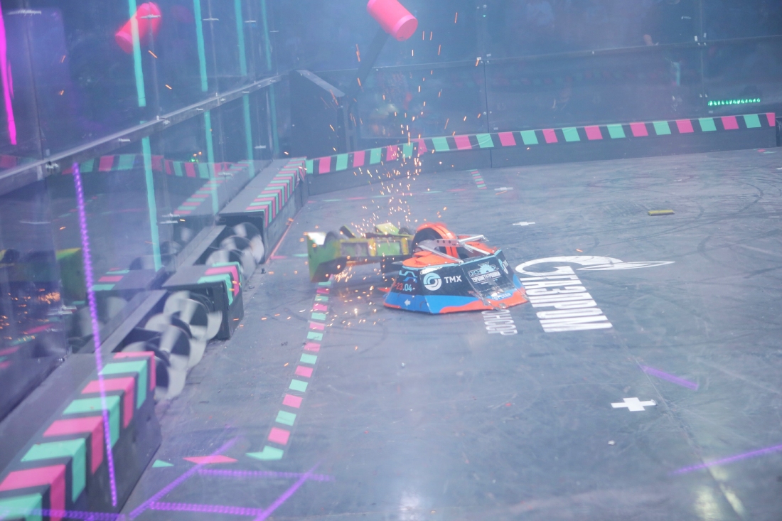 Эффектную победу в четвертьфинале одержала российская команда Energy Girls. Её розовый флиппер «Барракуда» сразу бросился на горизонтальный спиннер Tohid от TBD из ОАЭ. Несколько переворотов, и уже на исходе первой минуты арабский робот оказался поставлен на бок и не смог продолжить движение.