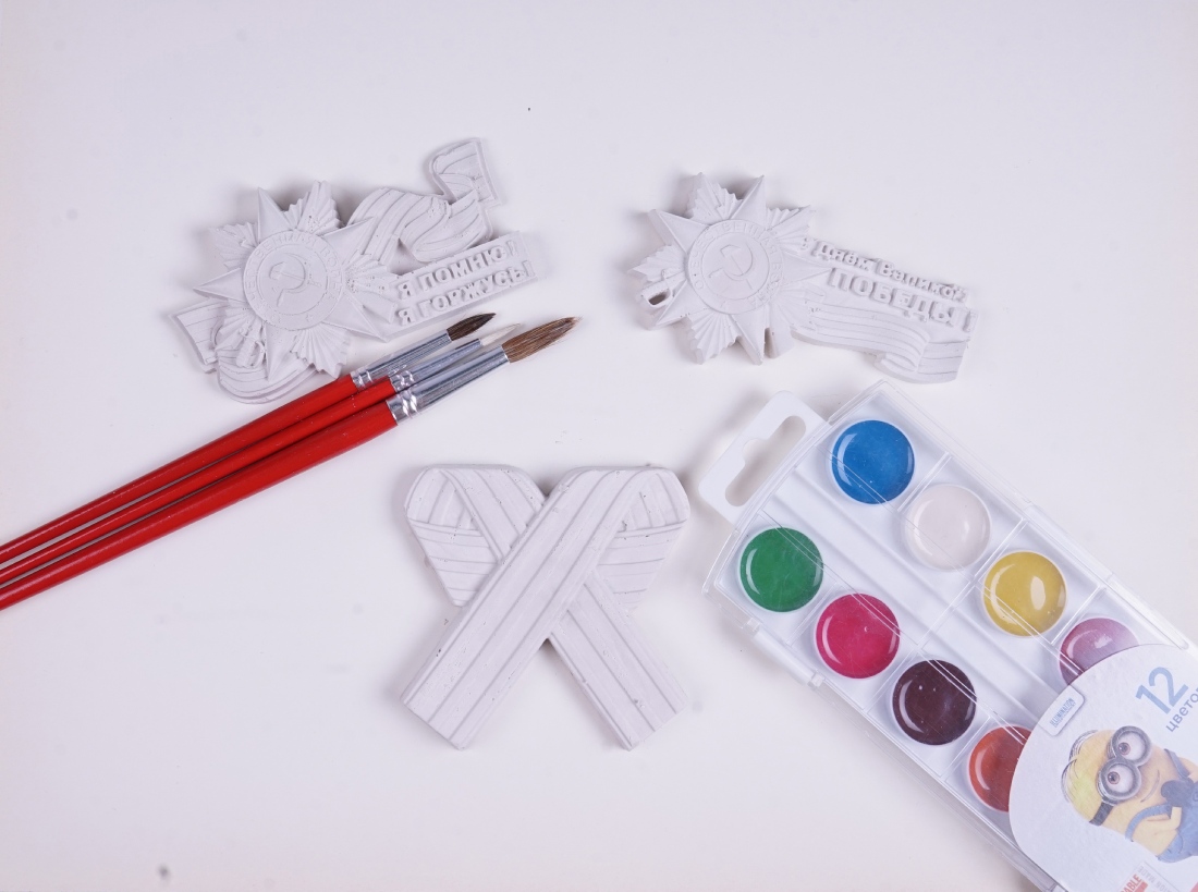 Разукрашивание гипсовых заготовок, выполненных в форме танка и самолета, фляги и военного жилета. Среди форм для раскрашивания – георгиевская ленточка.
