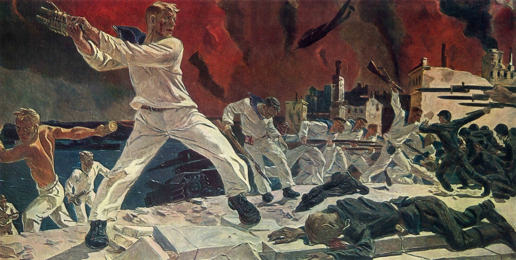 В этом произведении Дейнека отступил от сюжетности, привычных канонов советского искусства. Город в руинах, все небо и бухта закрыты дымом и полыхающим огнем, сражение идёт на разбитых белых плитах набережной. Сам художник отмечал, что он стремился максимально доступно изобразить не конкретное событие и место действия, а противопоставление. Точнее — вечную борьбу добра и зла, воплощенные в столкновении севастопольских защитников и вражеских полчищ.