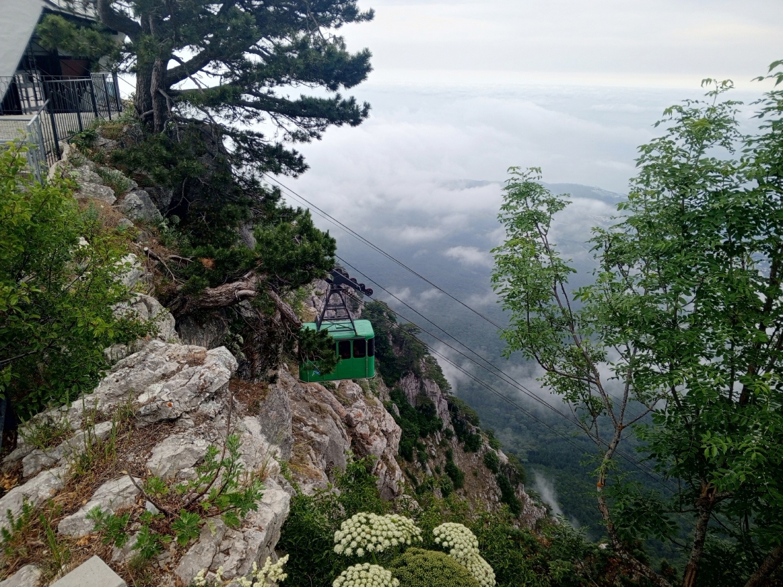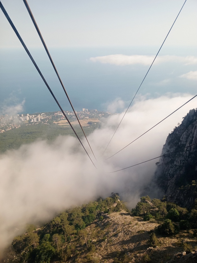 Поездка на канатной дороге занимает всего шесть минут. Но это, казалось бы, короткое время словно растягивается. Всё объяснимо. Время замедляется каждый раз, стоит лишь покинуть привычное окружение и оторваться от ежедневной рутины. Перед взором открывается зрелищная панорама на Южный берег Крыма. Но следует быть готовым к тому, что увидеть можно будет далеко не всё. А причина в «туманном» настроении Ай-Петри. Но порой это лишь подогревает интерес к предстоящим видам и создаёт атмосферу загадочности.
