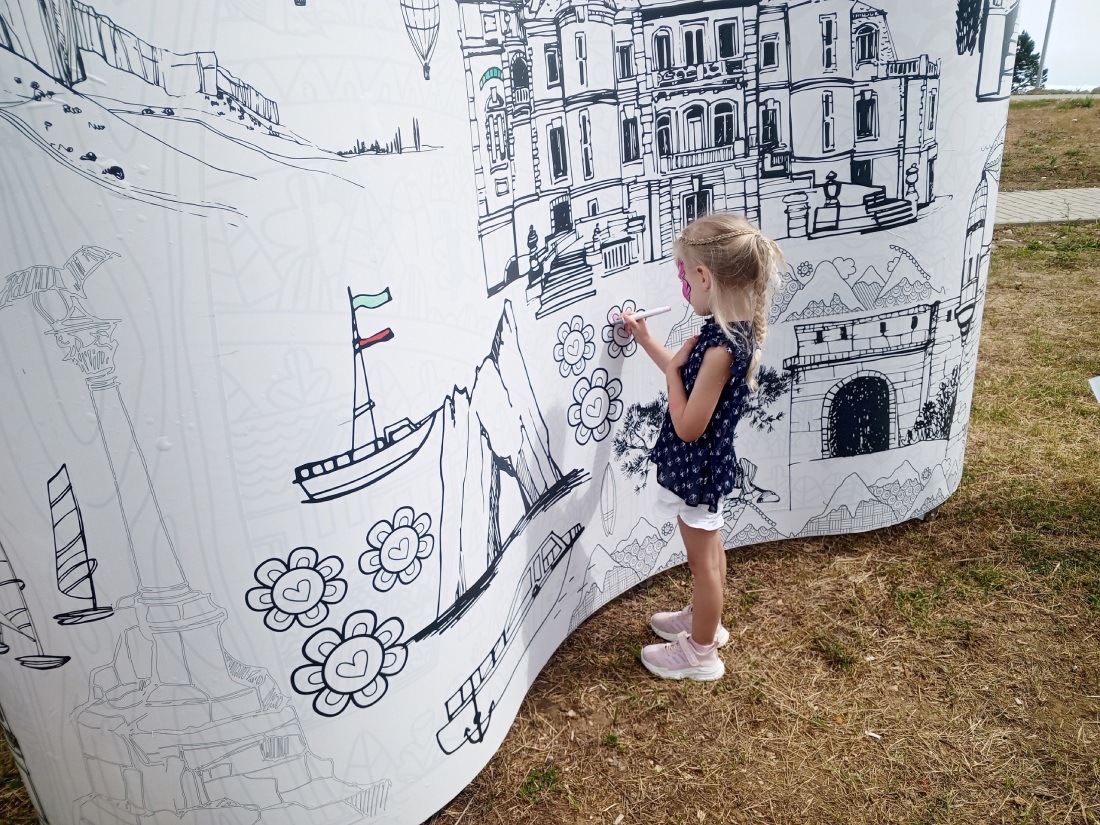 Настоящей рукотворной декорацией стала общая раскраска. Дополняя рисунок, гости стали авторами картины с главными крымскими достопримечательностями.