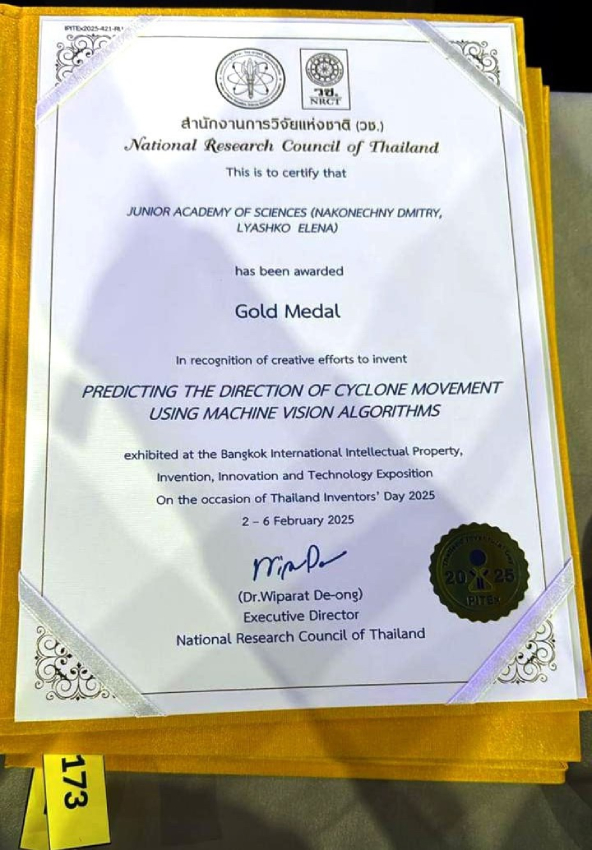 Золотая медаль также у Дмитрия Наконечного за научную работу «Предсказание направления движения циклонов с помощью алгоритмов машинного зрения». Консультант работы — методист Малой академии наук Елена Ляшко.