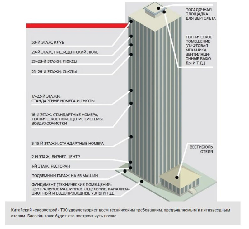 От момента установки первой плиты на подготовленную строительную площадку до застилания последней кровати в люксе на верхнем этаже отеля Т30 — всего 360 часов, то есть 15 суток. За счет чего получается выдерживать такие темпы?