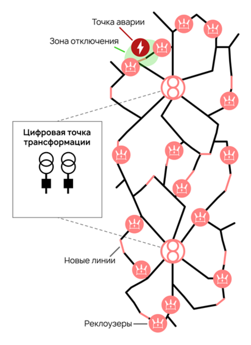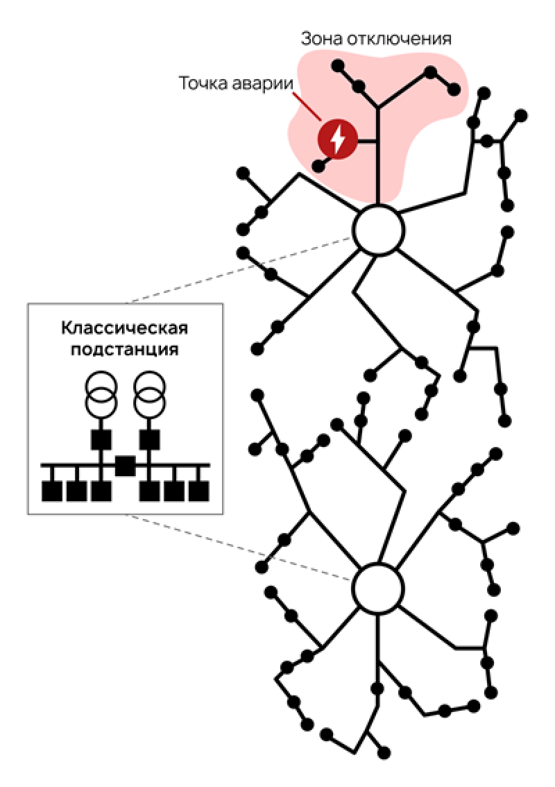Причем локализовать аварию при данной организации сети тяжело, потому что обеспечить энергией в авариной ситуации можно тех, кто сверху, а с теми, кто снизу, ничего не сделать, — пока ты не восстановишь линию, они все будут сидеть без света.