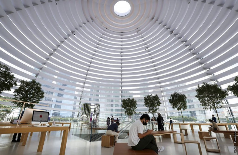 На сингапурском курорте Marina Bay Sands состоялось официальное открытие уникального магазина Apple. Здание выполнено в форме полусферы и размещено на воде.