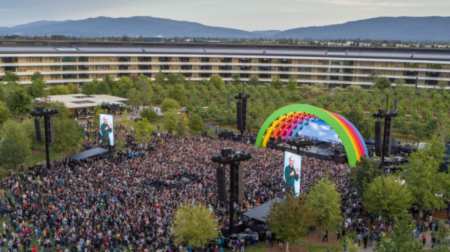 Оформление купола сцены, дорожек, и стаканчиков для кофе выполнено в цвета радуги, напоминающего старый логотип Apple, который можно было видеть на всех ее продуктах с 1976 по 1998 годы.