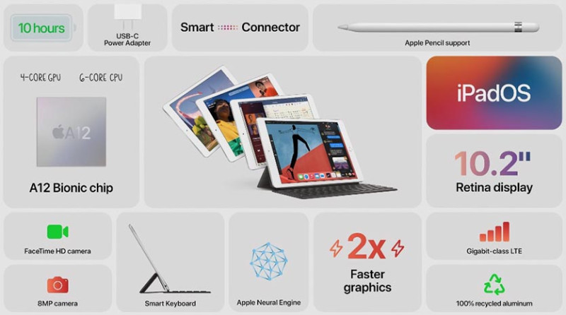 iPad 8-го поколения. Планшет получил экран диагональю 10,2 дюйма (ранее использовался экран диагональю 9,7 дюйма), поддержку фирменного стилуса Apple Pencil, фронтальную камеру FaceTime HD и тыльную камеру разрешением 8 Мп, модем LTE и, вероятно, самое главное — порт USB-C. Что касается автономности, то она составляет 10 часов.