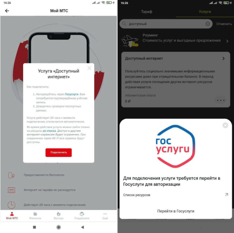 В сетях мобильных операторов связи проект «Доступный интернет» реализован в виде отдельной подключаемой услуги с нулевой абонентской платой. К примеру, в МТС ее можно активировать через фирменное мобильное приложение.
