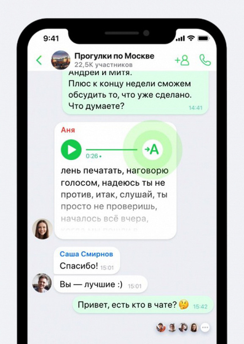 Что касается остальных функций, ICQ New во многом весьма современен. Тут есть боты, есть возможность поделиться не номером телефона, а псевдонимом, синхронизация истории переписки, возможность отправлять голосовые сообщения и так далее. Из необычного — функции искусственного интеллекта. К примеру, транскрибация голосовых сообщений.