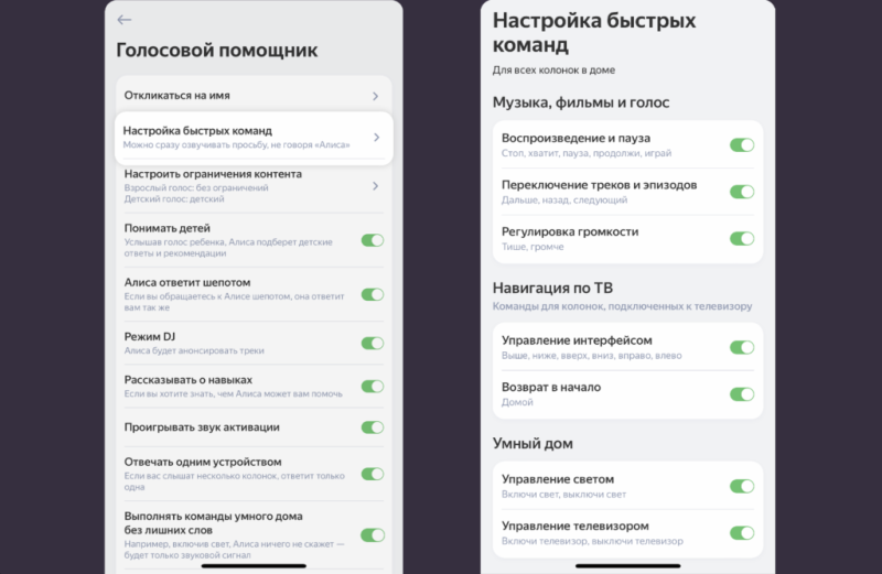 Чтобы включить или выключить быстрые команды, нужно открыть приложение «Дом с Алисой» (настройки голосового помощника, раздел «Настройки быстрых команд»).