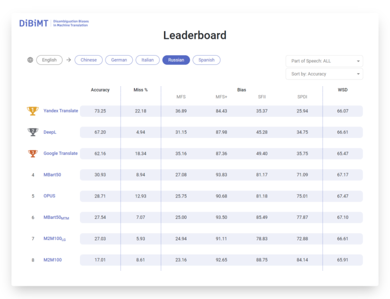 Бенчмарк DiBiMT — это эталонный тест для измерения процента ошибок (то есть неверного определения смысла или значения слова в контексте) в машинном переводе. Тестирование проходили как онлайн-переводчики, такие как Google Translate и DeepL, так и открытые большие языковые модели: mBART-50, M2M100, а также проект OPUS.