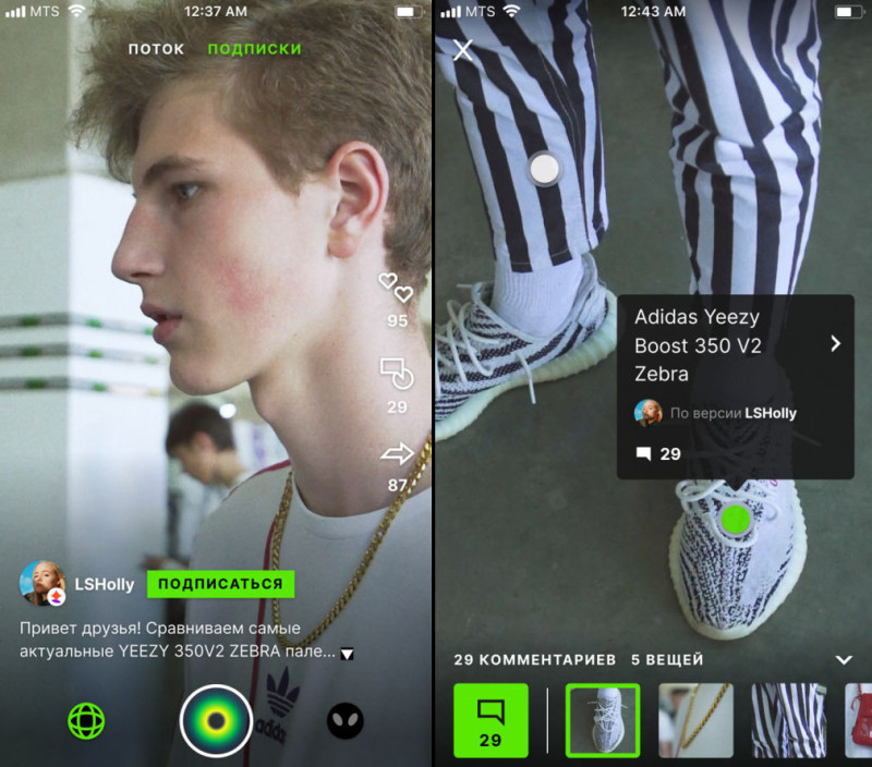 Интерфейс приложения состоит из ленты подписок и вкладки с рекомендованными видео. Если нажать на ролик, то у каждой вещи появится дополнительная информация о предмете одежды и другие видео с похожими образами.
