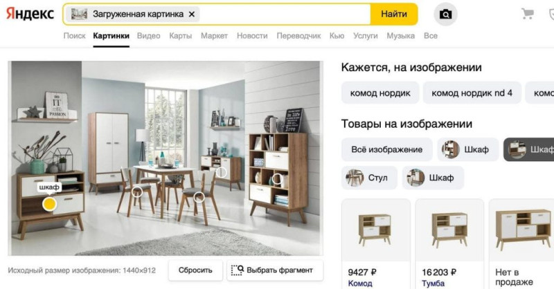 Например, если найти в «Яндексе» фотографию интерьера, отечественный поисковик выявит на нем предметы мебели и предложит их отдельный поиск в интернете. Аналогичным образом будет «обработана» и фотография людей в модной одежде.