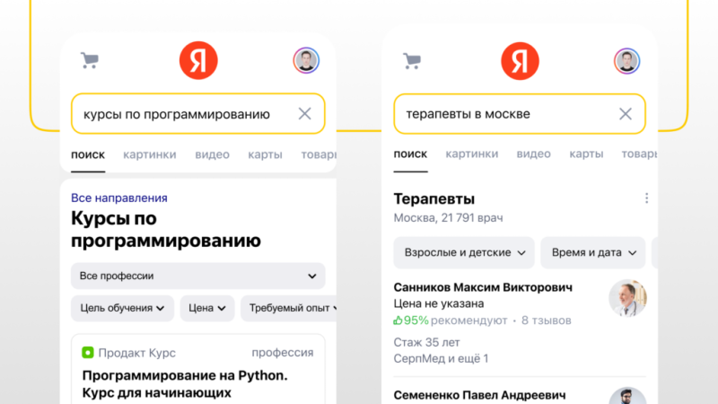 Поиск объектов. Y2 поможет выбрать врача, онлайн-курс или товар. «Поиск» не только индексирует веб-страницы, но и находит на них информацию об объектах, аккумулирует её и показывает в поисковой выдаче;