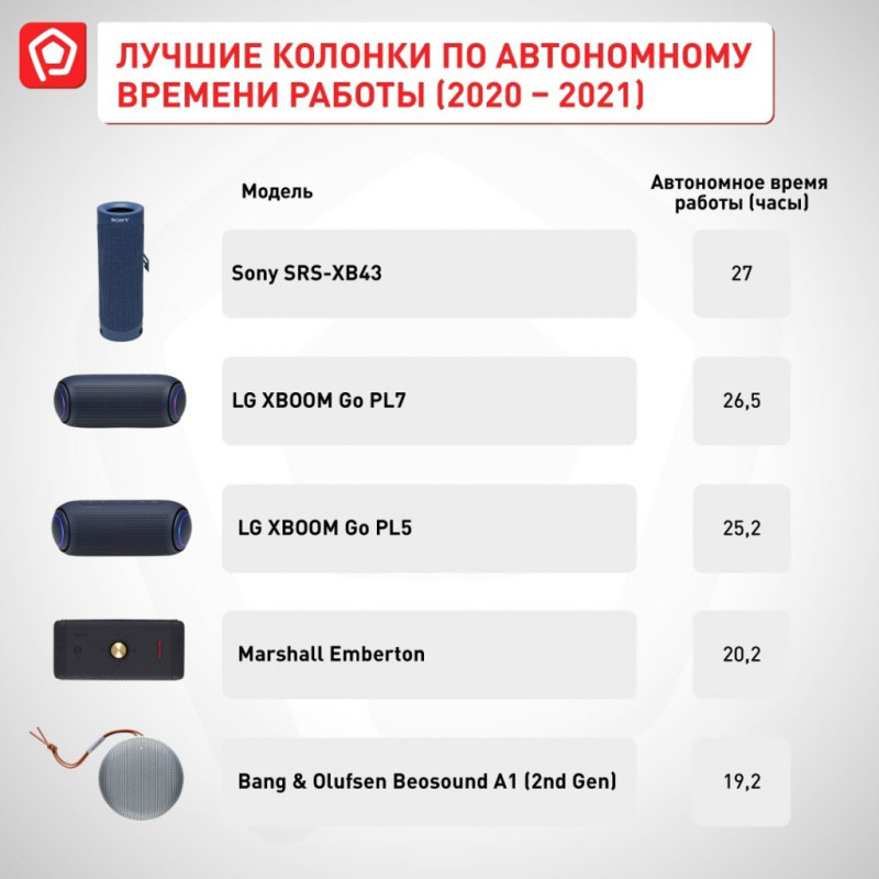 По времени автономной работы также выделяется Sony SRS-XB43, за которой идут LG XBoom Go PL7 и XBoom Go PL75.